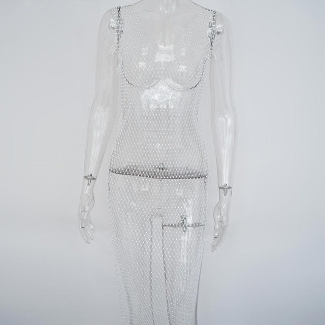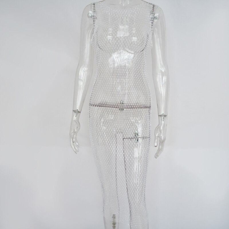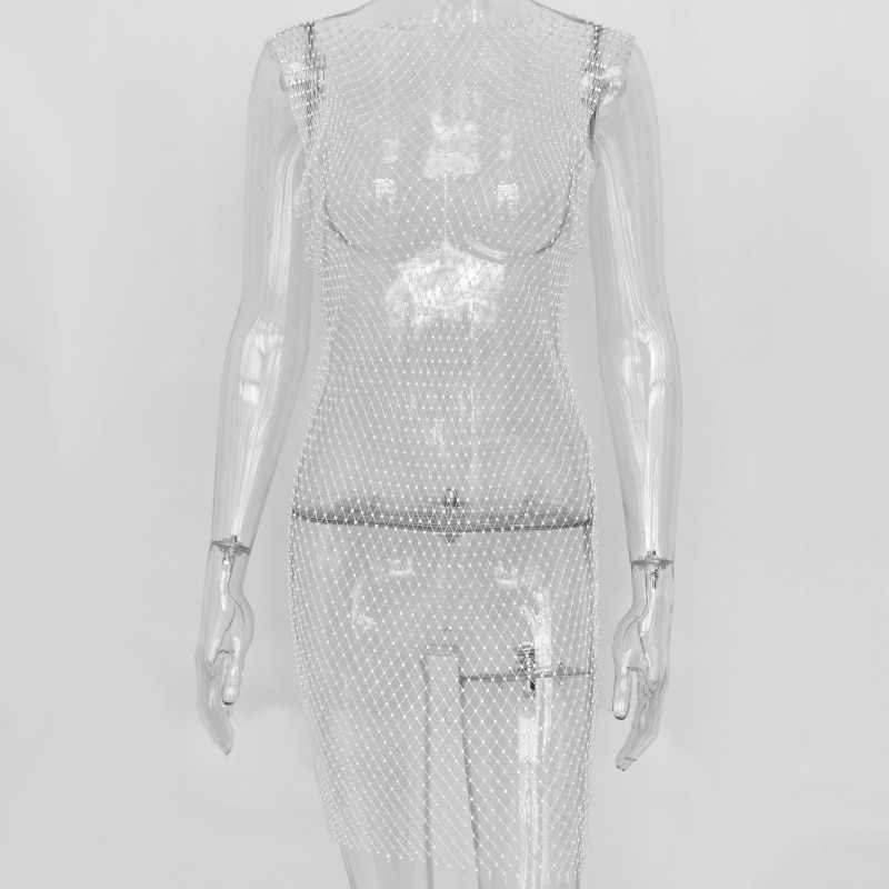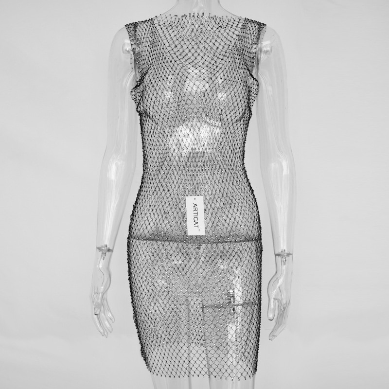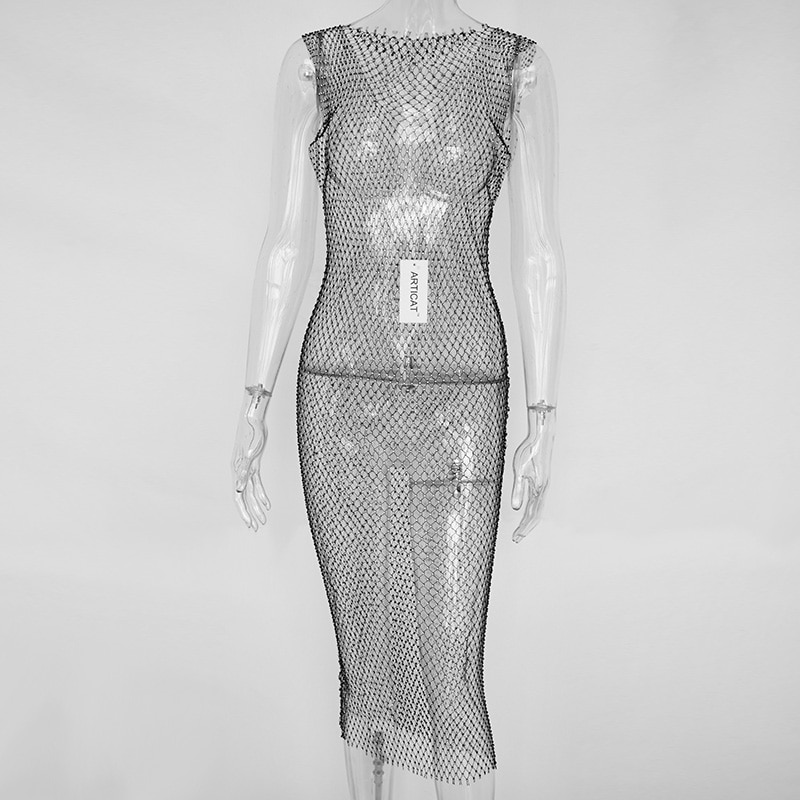 Articat Crystal Diamond Mesh Sexy Bodycon Dress Women Hollow Out Fishnet Summer Beach Knee-Leng Dress Transparent Party Vestidos