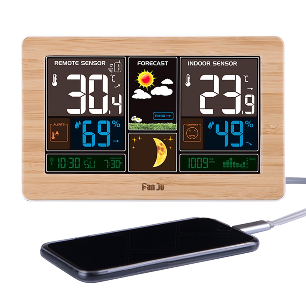 FanJu FJ3378 Digital Alarm Clock Weather Station Wall Indoor Outdoor Temperature Humidity Watch Moon Phase Forecast USB Charger