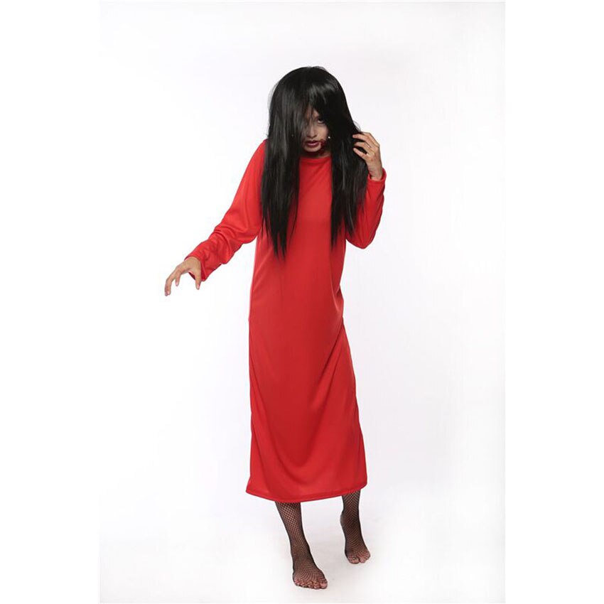 White Red Solid Plus Size Woman Gown Sadako Halloween Masquerade Scary Costumes with Wig Bride Terror Robe Dress for Female
